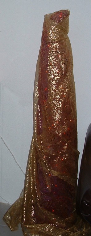 Deze lamp was een van mijn eerste objecten. Hij is gemaakt uit kippengaas met aan de binnenzijde een multicolor kerstlichtsnoer en organza bekleding in twee kleuren, wat een heel warm effect geeft als het licht aan is.